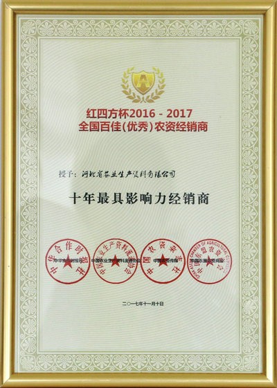 本網訊   近日,由中華合作時報、中國農業生產資料流通協會、中國東盟農資商會、中國農資傳媒主辦的“紅四方杯2016-2017全國百佳(優秀)農資經銷商”評選活動結果揭曉,按照公開、公平、公正的原則,經全國部分重點化肥生產企業、各級行業協會推薦、自薦、網絡投票、報紙投票、專家評審、媒體公示等程序,我公司成功當選為“十年最具影響力經銷商”。