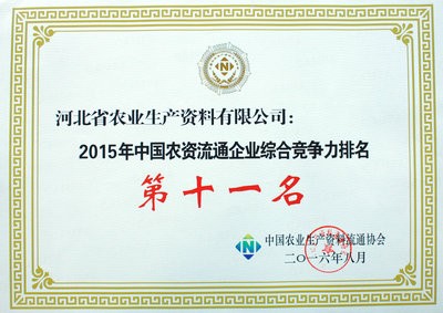 公司榮獲2015年中國農資流通企業綜合競爭力排名第十一名