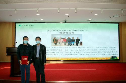 侯軍合(右)為資金營運部頒發“2020年度先進集體”榮譽證書