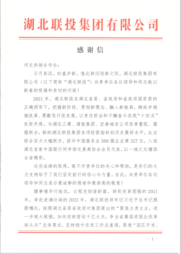 湖北聯投集團向省供銷社致感謝信