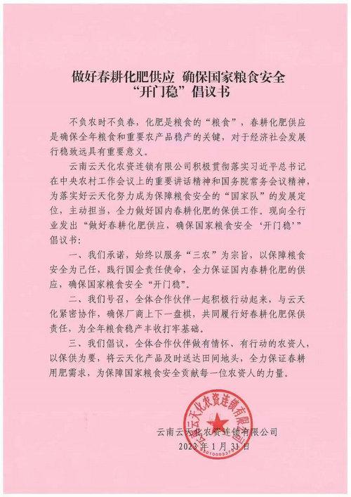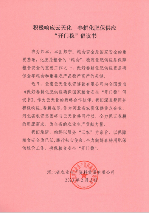 近日,云南云天化農資連鎖有限公司向全國發出《做好春耕化肥供應確保國家糧食安全“開門穩”倡議書》。作為云天化的戰略合作伙伴,我們深表贊同并積極響應。春耕在即,作為河北省農資保供重點企業,河北省農資集團將與云天化共同行動,全力保證春耕的用肥需求,為全省的農業生產貢獻力量。