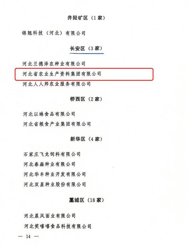 本網訊    近日,石家莊市人民政府公布了石家莊市農業產業化重點龍頭企業名單,河北省農業生產資料集團有限公司獲評“石家莊市農業產業化重點龍頭企業”。