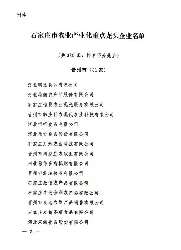 石家莊市農業產業化重點龍頭企業名單