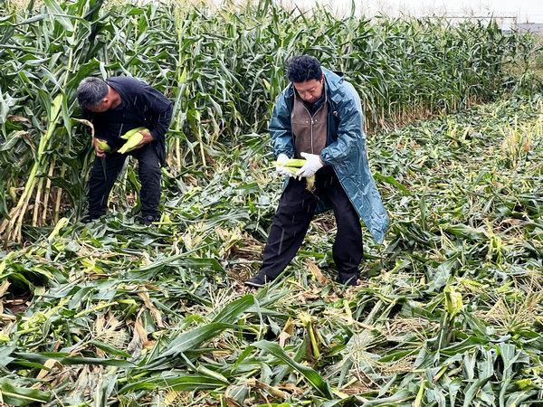 公司種植的400多畝甜玉米如果錯過收獲期,將損失巨大。可雨勢一直未停,田間泥濘不堪,常規收割機無法作業,豐安公司經理劉佳緊急調度了幾臺“四不像”拖拉機及裝載機,全體員工冒雨下地,搶收作業。有些低洼地塊連拖拉機也進不去,劉佳帶領劉磊、石峰、化立成、王繼唯、張海森等員工,跳進齊膝的泥水里,一穗一穗地徒手掰下,再深一腳淺一腳地肩扛手提運到地頭。雨水混著汗水,衣服沾滿泥漿,每個人都在拼盡全力,只為多搶回一穗玉米,保護豐收果實。