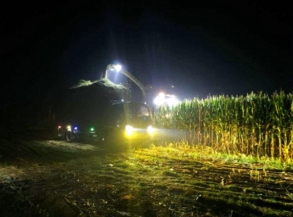 青貯作業地塊大、時間緊,搶收同樣面臨挑戰。為趕在雨歇窗口期完成搶收,豐安團隊決定晝夜不息、連續作戰,實行全天候輪班。劉佳天不亮就帶頭下地,劉磊、高朋、王繼唯深夜在田間協調機械、清理地塊,大家餓了就在田埂上扒幾口盒飯,困了就在駕駛室里輪流瞇一會兒,忙到凌晨三點結束工作。與此同時,王立威、張紅同樣全力以赴,從清晨6點持續奮戰至次日凌晨2點,不停地過磅統計,收款調度,期間經手車輛達1000余輛,確保運輸有序、賬目清晰。