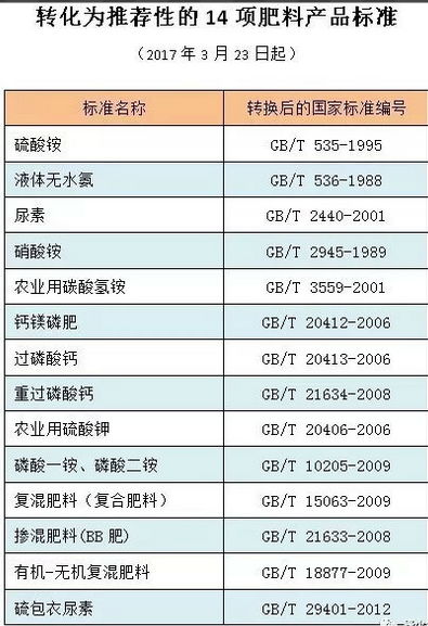 2017年3月23日,國家質(zhì)量監(jiān)督檢驗檢疫總局、國家標準化管理委員會聯(lián)合發(fā)布公告,將1077項強制性國家標準轉(zhuǎn)化為推薦性國家標準。其中,涉及尿素、磷酸銨、硫酸銨等14項肥料產(chǎn)品國家標準。