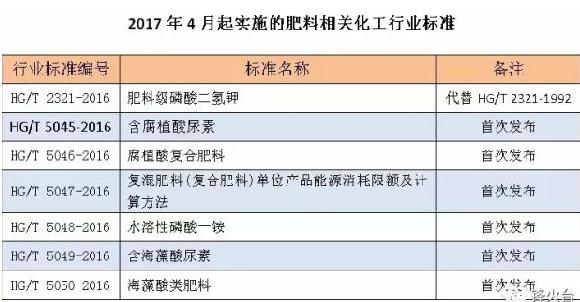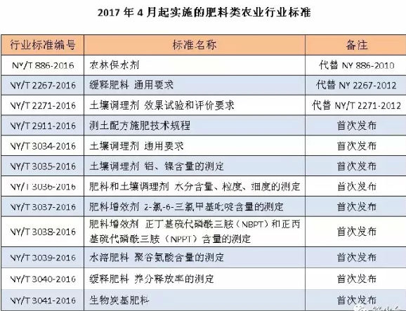 根據農業部和工信部公告,自2017年4月1日起,與肥料相關的12項農業行業標準和7項化工行業標準正式實施。12項農業行業標準主要涉及農林保水劑、土壤調理劑通用要求、緩釋肥料通用要求、生物炭基肥料、測土配方施肥技術規程等,7項化工行業標準主要涉及含腐植酸肥料、含海藻酸肥料、水溶性磷酸一銨、肥料級磷酸二氫鉀等新型肥料。